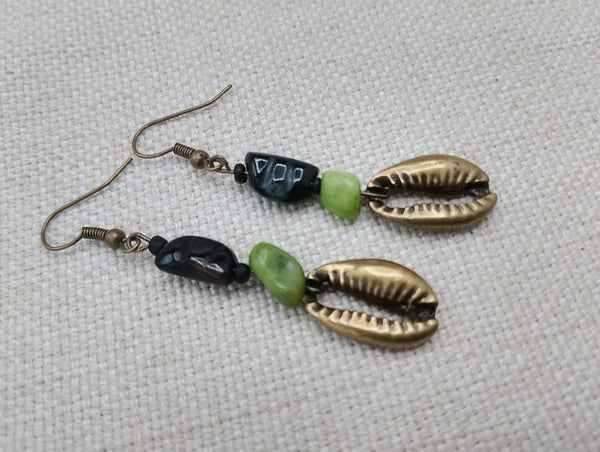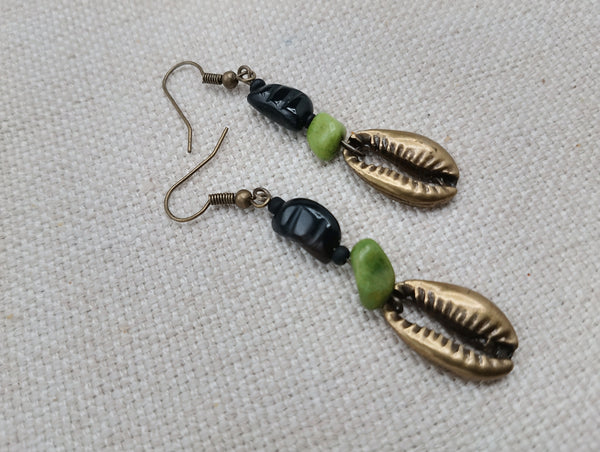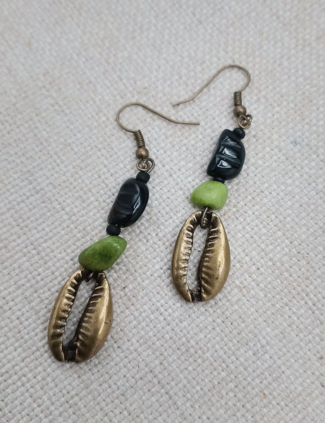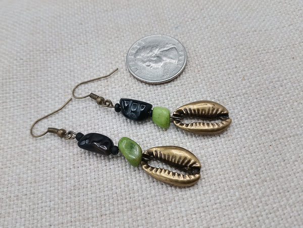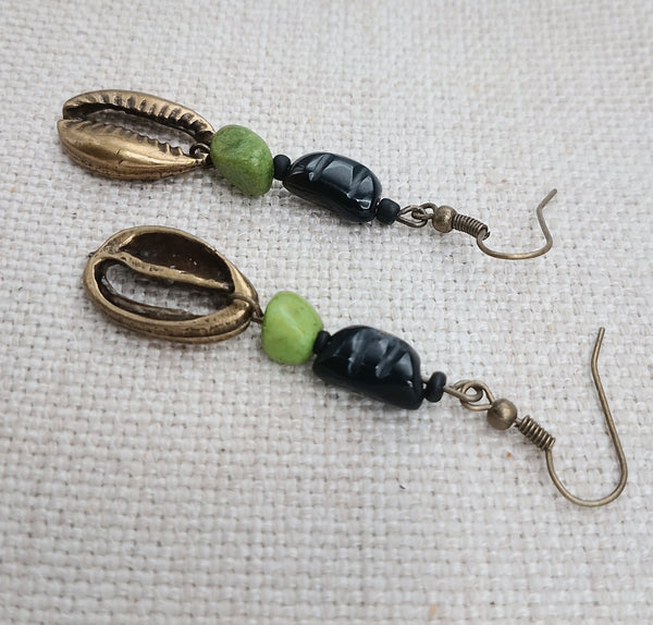 The brass metal cowrie pendant earrings hang approximately 2.5 inches long. The earrings are beaded with textured glass beads and green stone beads. The earrings will come with back stoppers. Please keep away from young ones as they may pose a choking hazard. If you have any questions please feel free to contact us at anytime.
