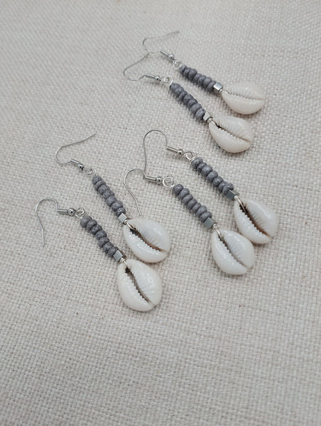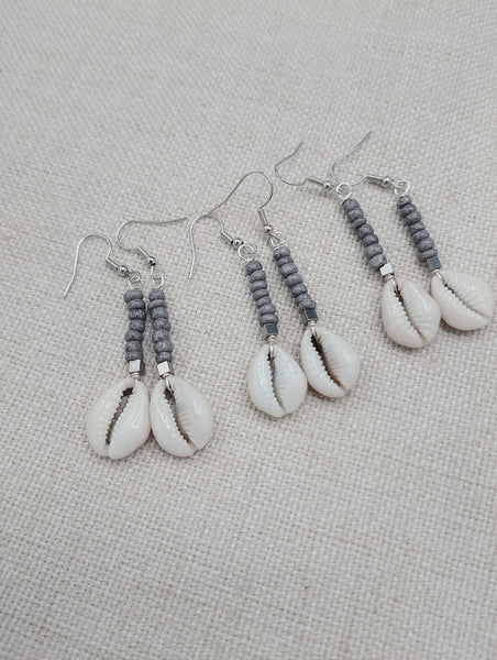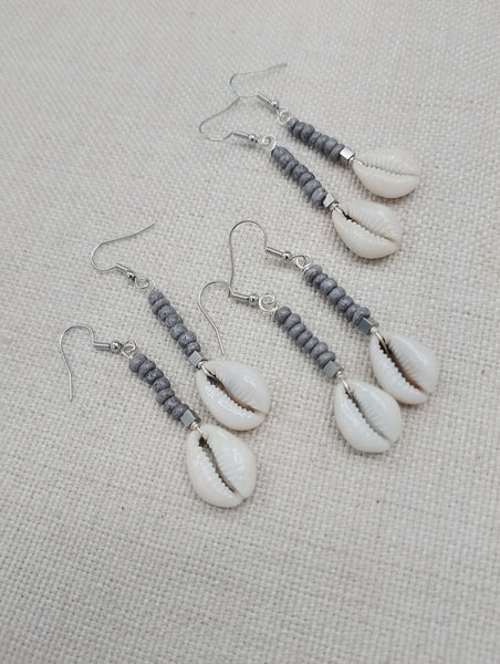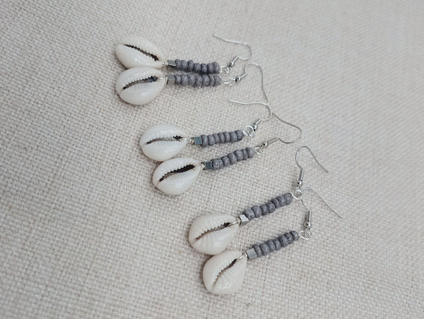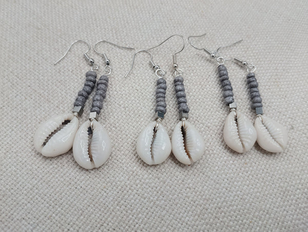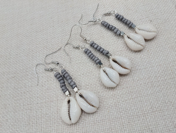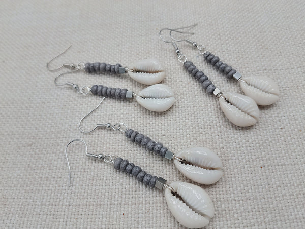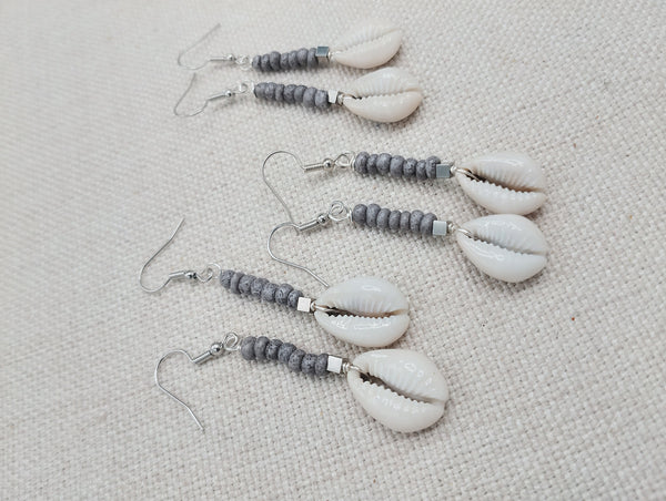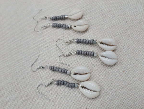 The small women dangle earrings are approximately 2.5 inches long with wire. The earrings have small cowries, silver accents and gray small glass beads. Please keep from young ones as they pose choking hazards. If you have any questions please feel free to contact us at anytime. You will receive one pair with each order.