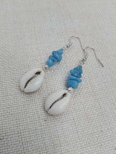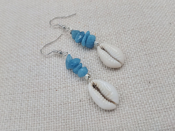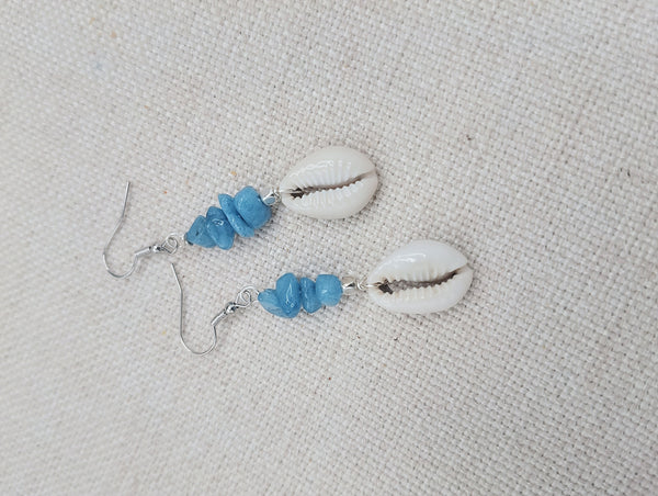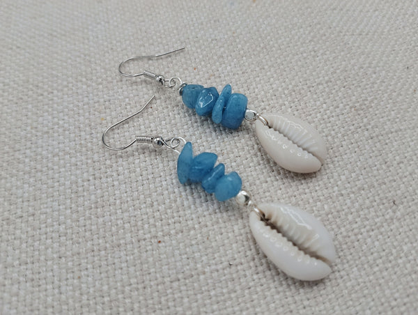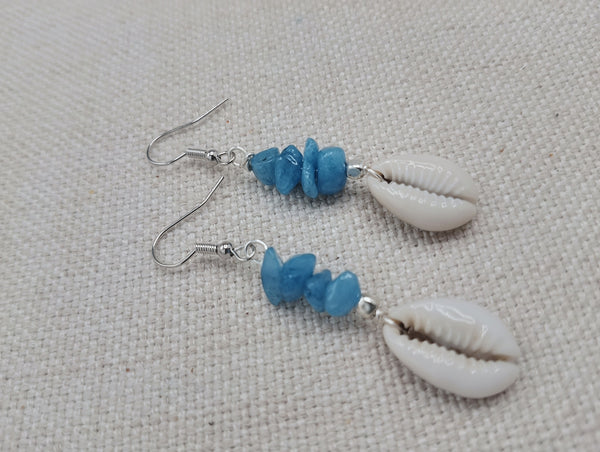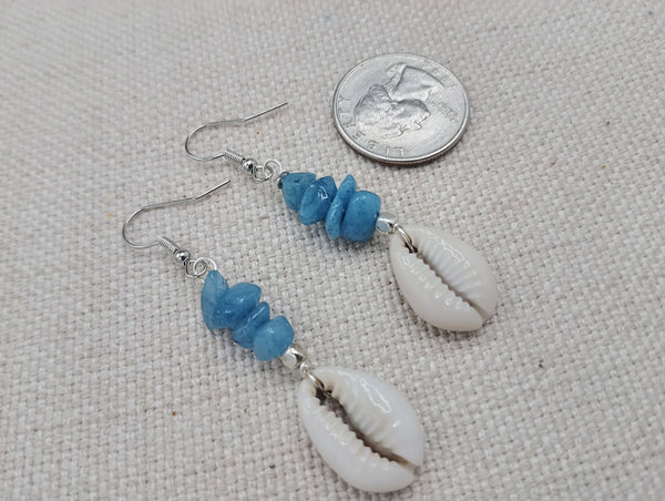 The earrings have these beautiful blue and Cowrie. The earrings are approximately 2.25 inches long. These have silver wire and will come with backstoppers. These are lightweight. Please keep from young ones as they may pose choking hazard. If you have any questions please feel free to contact us at anytime.