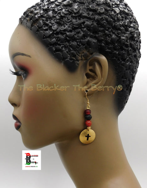 The cross earrings are made with brass, agate beads and glass beads. The earrings are 2.5 inches long. The earrings will come with back stoppers. If you have any questions please feel free to contact us at anytime.