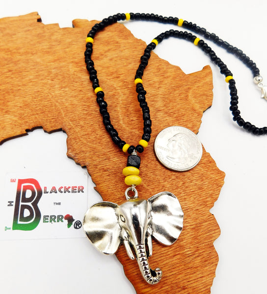 The elephant necklace is a beaded piece with black and yellow glass and wooden beads. The pendant is 1.5 inches long. The necklace is 16 inches long and closes with a clasp. If you have any questions please feel free to contact us at anytime.