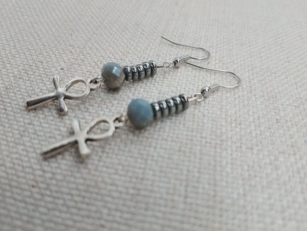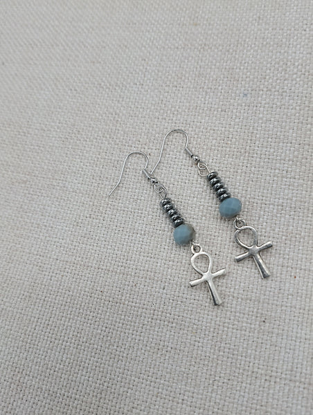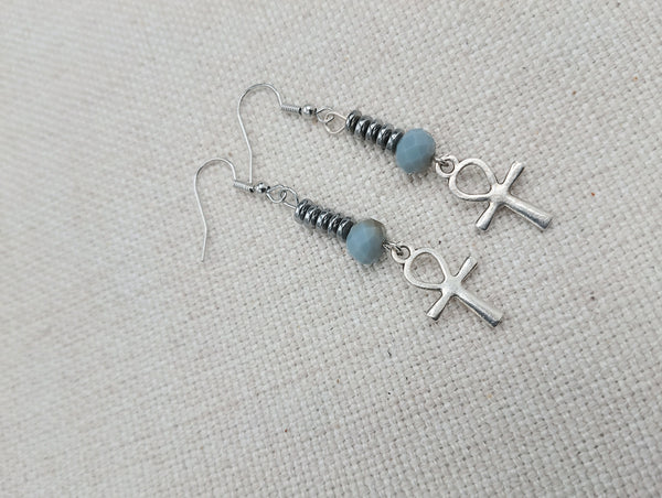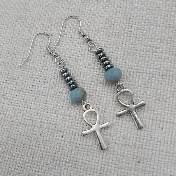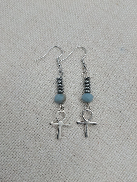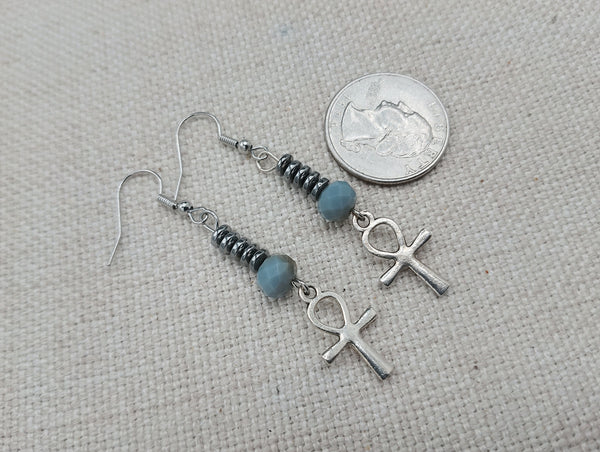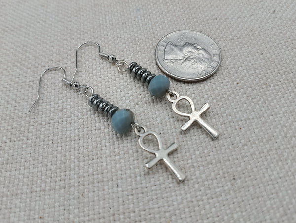 These are small antique silver Ankh beaded earrings. The small silver Ankh is beaded with glass and hematite beads. These hang approximately 2.25 inches long. They are lightweight and will come with backstoppers. Please keep from young ones as they pose a choking hazard. If you have any questions please feel free to contact us at anytime.